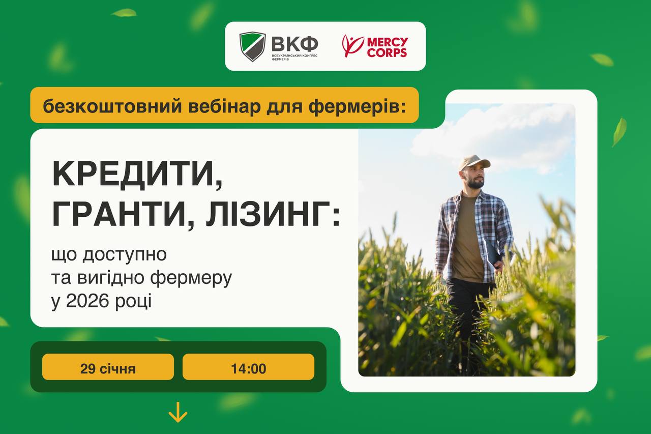 Всеукраїнський конгрес фермерів (ВКФ) у партнерстві з міжнародною організацією Mercy Corps запрошує аграріїв на вебінар: «Кредити, гранти, лізинг: що доступно і реально вигідно фермеру у 2026 році та як до цього підготуватися».